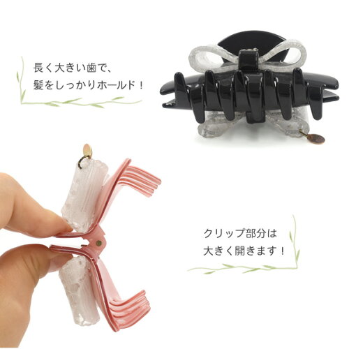 忙しいときでも簡単に使えるヘアクリップは デイリーはもちろん、オフィス使いにもオススメ! クリップ部分は大きく開き、長い歯で髪をしっかりとホールドします。