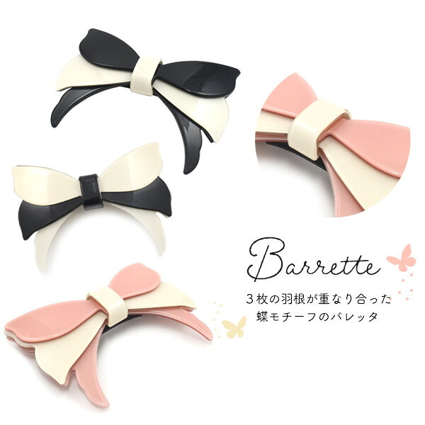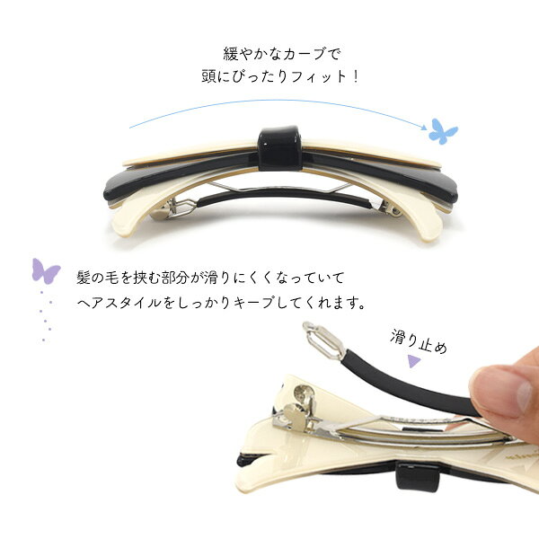 3枚の羽根が重なった立体的なデザインで 頭の形に沿った緩やかなカーブとクリップ部分の滑り止めが しっかりヘアスタイルをキープしてくれます。
